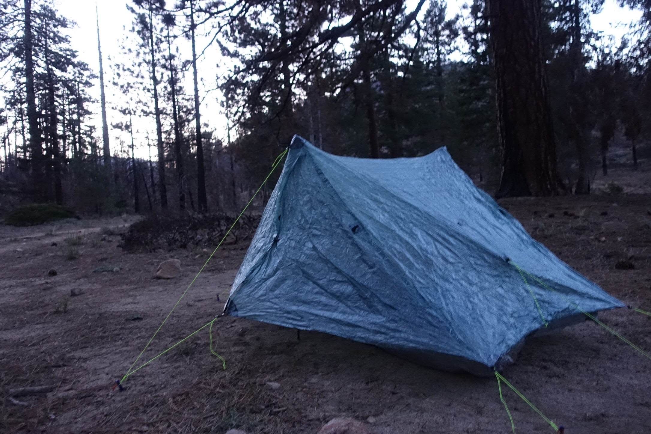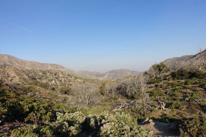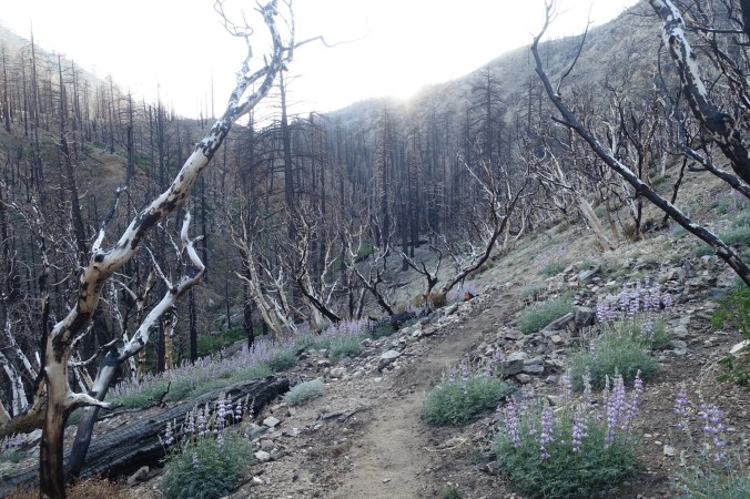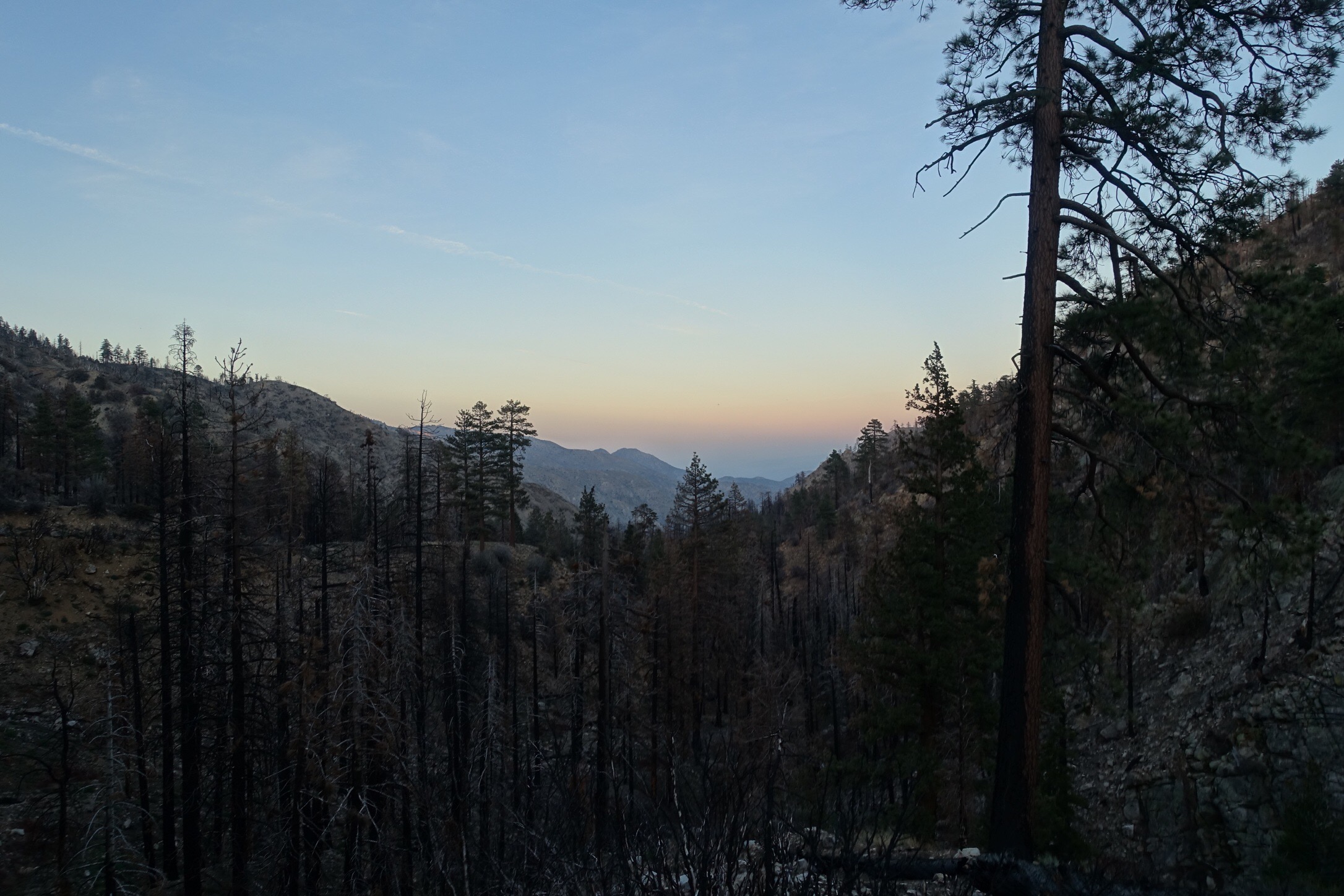 We set of at about 5pm. It was still warm as we climbed out of the valley that we’d spent the day in. I kept expecting to see the burn zone, but it came upon us more gradually than I expected it would. It wasn’t until we approached our primary water source that it was clear that we were in a burn zone. The ground and the trees around us were black. We stopped at the creek to filter water and have dinner. It was disappointing to see that some of the people that we’d discussed the camping restriction with earlier in the day had chosen to camp there. That said, we hadn’t seen any signs notifying hikers of the nature of the restriction, which added to the confusion.