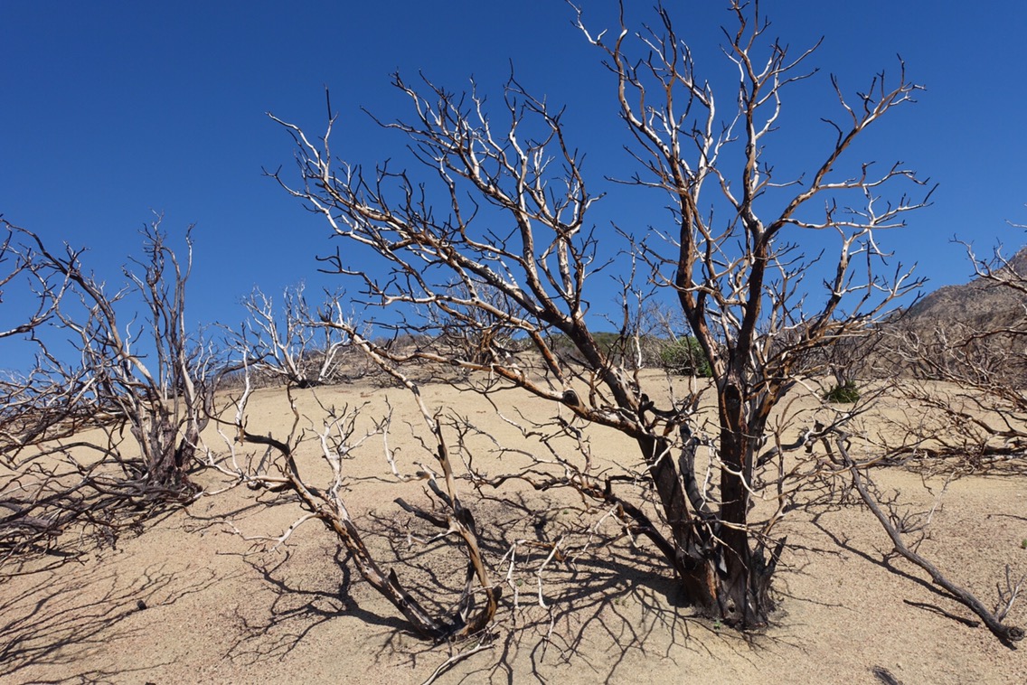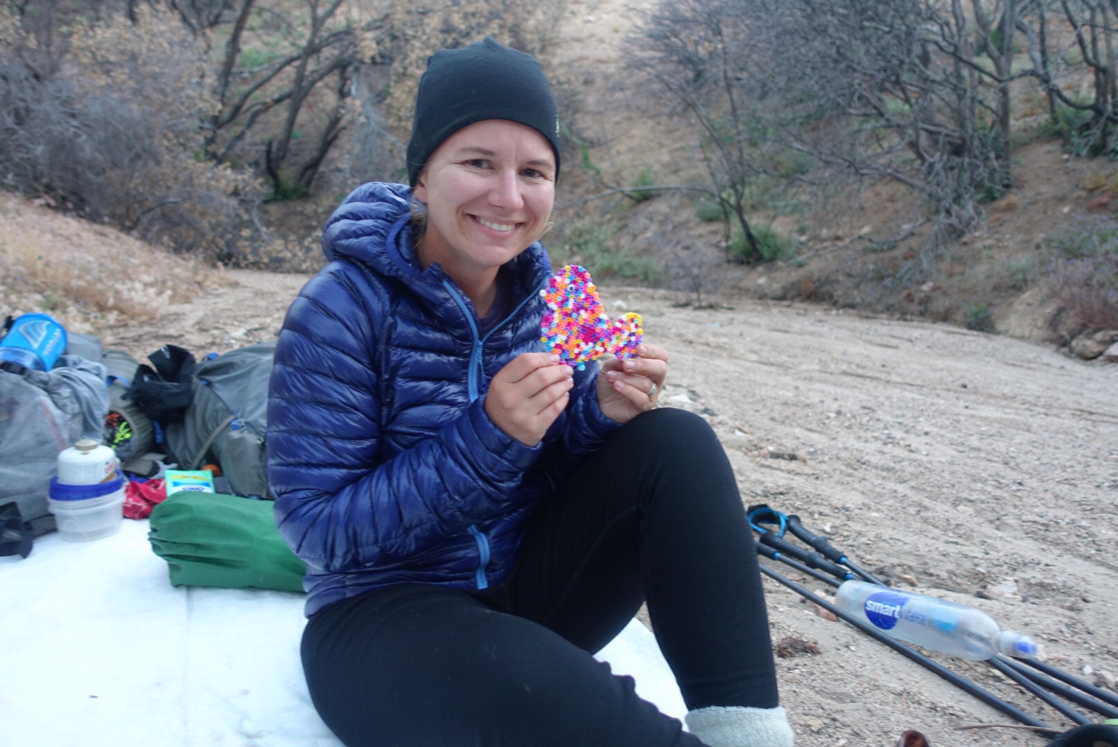 High on our trail magic, it was now time to find a place to sleep. This turned out to be tougher than we’d imagined. There were very few flat spots and those that we found were either exposed to the strong winds that had picked up in the afternoon and/or in the soft ground from the burn. Finally, we found a semi-protected spot up a dry creek bed from the trail that was hidden behind a couple trees. The spot actually isn’t too bad (I hope) and much better going another 7 miles to the next established camping area.