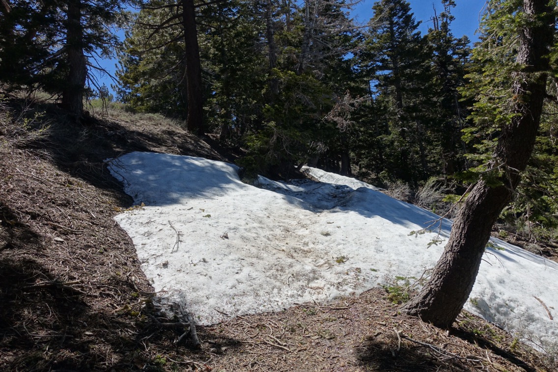 In the afternoon we had more tree cover and the weather cooled down. There were even some patches of snow, which seemed crazy given our hot morning. This meant that in the afternoon the miles went much easier and I didn’t drink as much water. There was actually one off-trail water source that we’d heard mixed information about, but we were able to pass it by because our 8 liters combined water turned out to be enough.