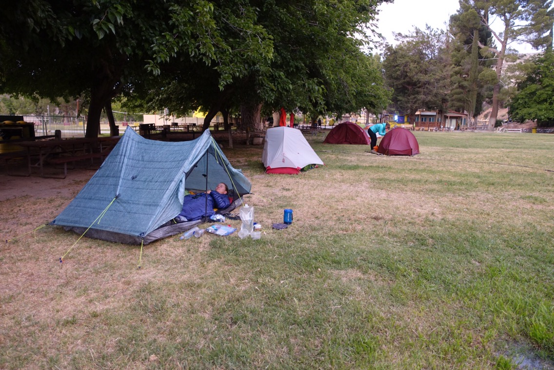 Instead, our afternoon was filled with town chores. We rented towels for showers, did laundry, chatted with other hikers, uploaded blog posts, and dealt with future resupplies. Michael even jumped in the pool (I decided that it was too cold and opted to stay in my wool base layer). The place was filled with familiar faces, including Tin Man, Captain Bubbles, Martin (Mr. T), Travis, and Kelsey. Just a chill way to spend our afternoon.