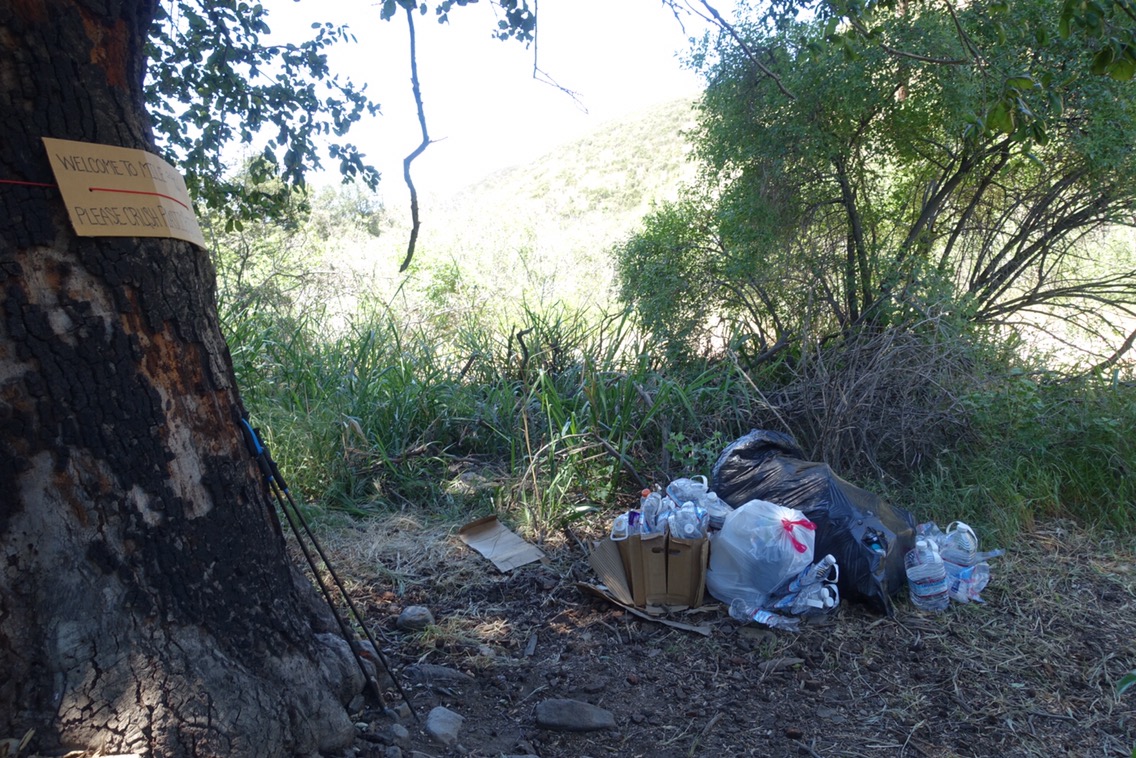 We stopped for lunch a few miles later under tree near a road. There was a small water cache there, but mainly it was just a lot of trash that was left. This is one of the unfortunate side-effects of some of the caches.