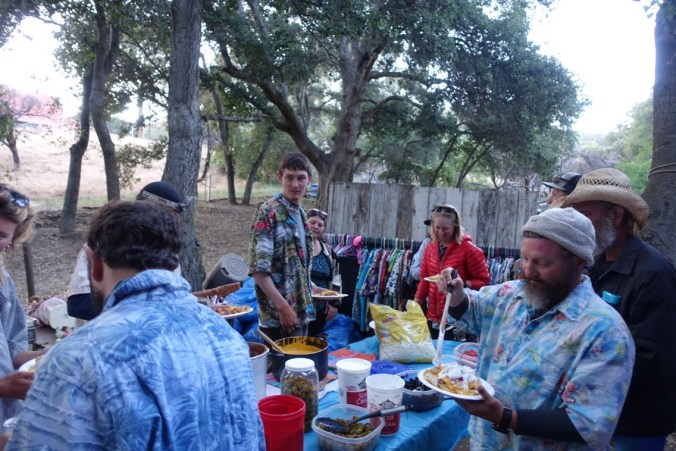 As soon as we set up camp we headed back to the front of the house for beer and taco salad. Avo, Gabs, Kelsey, and Travis had just shown up! When dinner time rolled around, Terrie came out with instructions — and a wooden ruler to enforce them! Hikers who accidentally put their plate over the food received a quick slap on the ass 😉