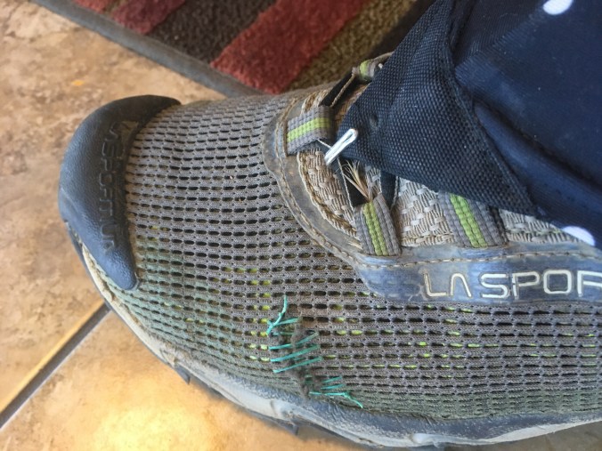 This morning, we enjoyed breakfast at the hotel again before Michael headed to the local Big 5 to pick up his Sierra gear. He couldn’t get a ride there and had to be walk the whole way (1 mile). He got his gear and picked up a few more groceries before getting a hitch back. Then he stitched up his damaged shoe with a needle and thread. And by thread I mean dental floss. He took a picture: