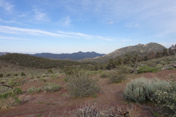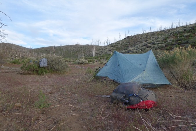 I set a goal of hiking 25 mikes today, and by mid-afternoon we decided that we’d take the first decent tent site we saw after mile 689. There wasn’t anything listed on Guthooks and it was in the middle of a big descent, so it wasn’t clear what the options would be or how much further we’d have to hike. At a saddle near the top we saw a couple exposed sites and continued on, hoping for both protection from the wind and flat ground. Amazingly, there were several flat sites right at mile 689.1 — almost exactly at our goal. The area even appears to be sheltered from the wind. Success!