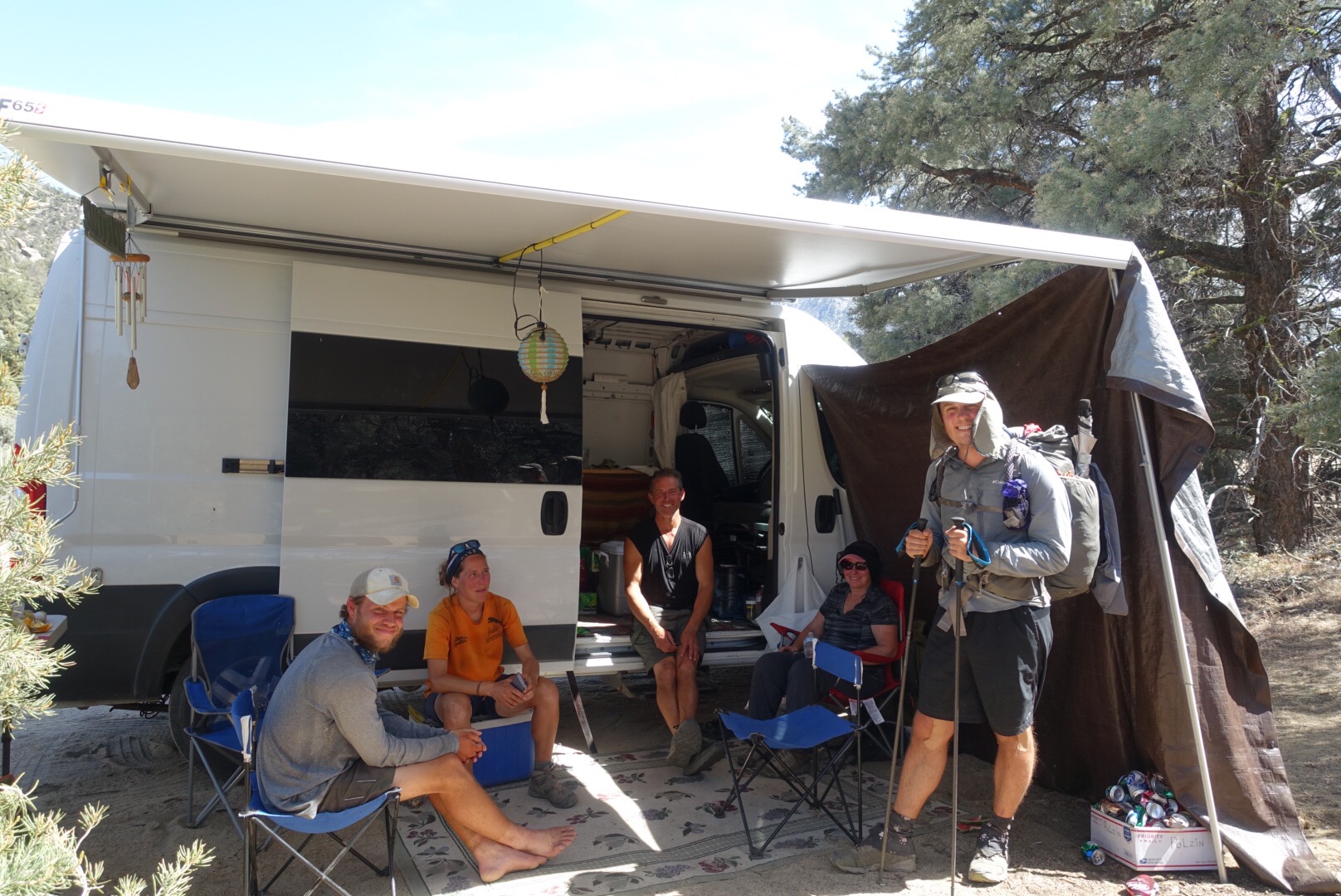 Not 100 yards later and we saw a sign advertising trail magic! A van was set up on the dirt road and it had a big awning for shade. I was quickly offered a hot dog and a soda. Although I’d just eaten lunch, I couldn’t say no. That would be rude! And nothing tastes better than a cold soda after a hot day of walking. Our trail angel was a PCT hiker who’d had to get off trail due to injury and decided to spend some time trail angeling. The rest, shade, food, and conversation really hit the spot. They even tried to bestow trail names. Banana Boat or American Turban for Michael (because a hiker thought he smelled like sunscreen and due to his hat), and Voice of Reason for me (because that’s my job). I don’t see these going anywhere though. Our trail angel also mentioned that he’d been up at the Onion Valley trailhead (our first stop in the Sierras) and that people seemed to be in good spirits. That’s the best news we’ve heard in awhile about the upcoming section (not that it was very specific, but we’ll take it)! A nice relief from the fear mongering we’ve been hearing.