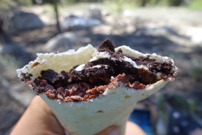 Our afternoon snack: a burrito with chocolate hazelnut spread, Joe Joes (Oreos), and the crushed remnants of our cinnamon candied almonds. So good.