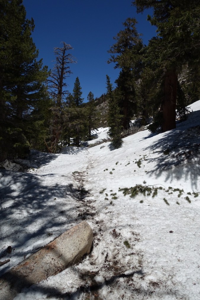 There ended up being quite a bit of snow cover, some of which required navigation to make sure that we were heading in the right direction. We even donned our microspikes to help give us additional traction (although the snow was already getting a little slushy). The next several miles (722-725) ended up taking much longer than we expected they would.