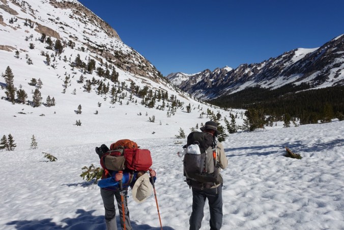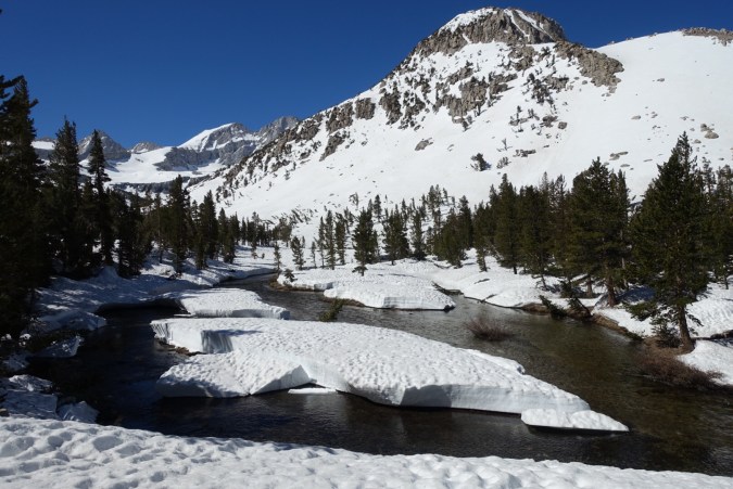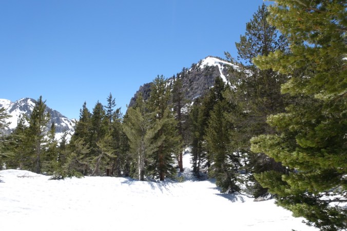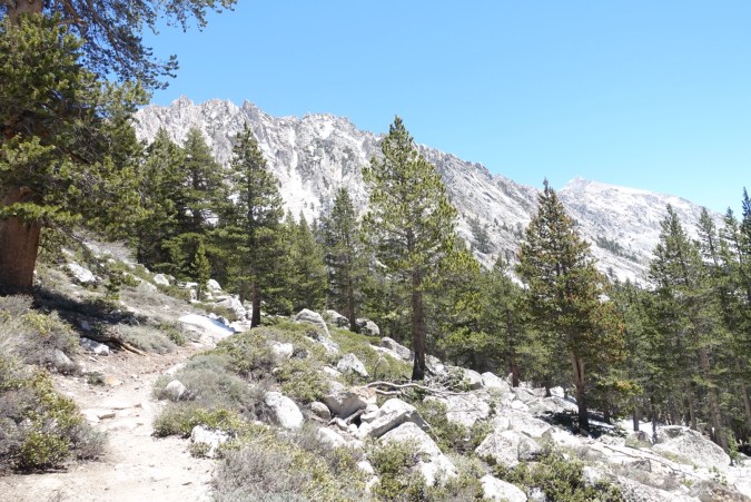 We continued to scout out the trees as we walked out on the Bullfrog Lake trail toward Kearsarge Pass, but none of them had dry space for a tent. We decided as a group that we’d go around to the back of Bullfrog Lake, and if there wasn’t anything there we’d camp on the snow. After that the trail would climb too much to make finding anything likely.