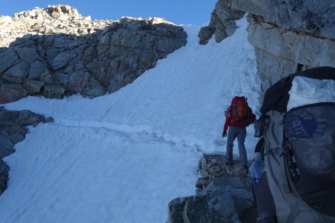 We stopped for lunch in Vidette Meadow, the low point of today’s trail, and then started climbing back up. Our goal for the day was to camp near the Kearsarge Pass trail junction, which would mean a nice early afternoon stop for us. We were treated to some dry trail before we were back to scrambling in the snow. At one point we climbed up a large snowy hill only to have to rock scramble to get back to the trail.