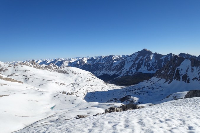 Normally there would be switchbacks all the way up, but they’re currently under feet of snow. We’d have to make our own switchbacks. Or we would have had to had it not been for the crazy people who went before us when the snow was soft in the afternoon and left nice footprints behind. We followed the steep switchbacks up the pass. You wouldn’t want to slip here as you’d slide a couple hundred feet down the mountain along the icy, hard snow. A few times, I used the head of my whippet to stab the ice and give me extra support as I climbed.Finally, we reached the exposed switchbacks higher up. I threw my poles onto the switchbacks and climbed up and over the rocks to get up on them. Solid ground! Walking on dirt, the path was easy.