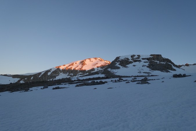 We took the obligatory pictures at the top of the pass and then headed down. It wasn’t yet 7:00 a.m. and the snow was still hard. Following the tracks of those that had glissaded down the mountain would not be an option for us (if the snow isn’t soft enough it is really painful and dangerous).