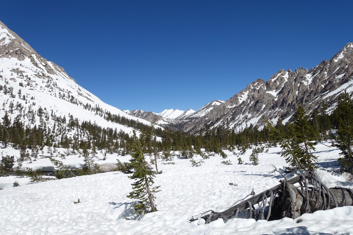 We continued to scout out the trees as we walked out on the Bullfrog Lake trail toward Kearsarge Pass, but none of them had dry space for a tent. We decided as a group that we’d go around to the back of Bullfrog Lake, and if there wasn’t anything there we’d camp on the snow. After that the trail would climb too much to make finding anything likely.