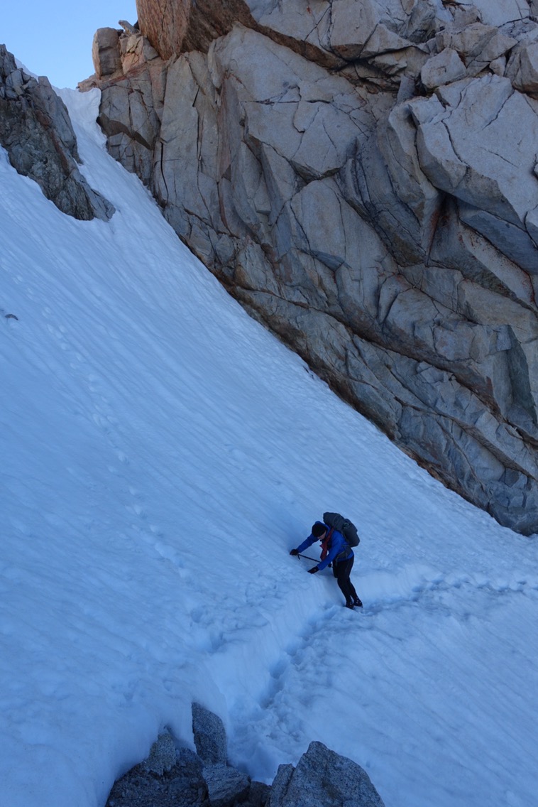 We took the obligatory pictures at the top of the pass and then headed down. It wasn’t yet 7:00 a.m. and the snow was still hard. Following the tracks of those that had glissaded down the mountain would not be an option for us (if the snow isn’t soft enough it is really painful and dangerous).