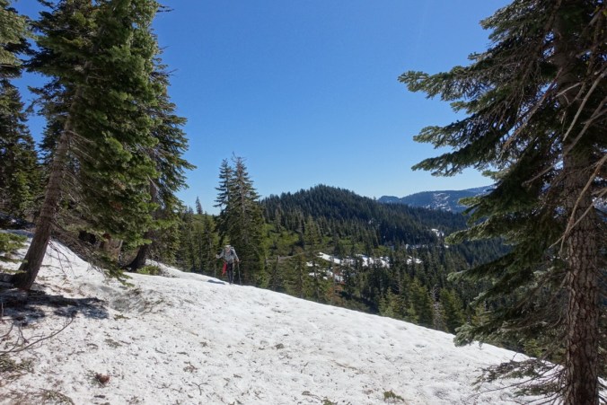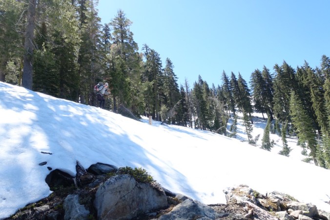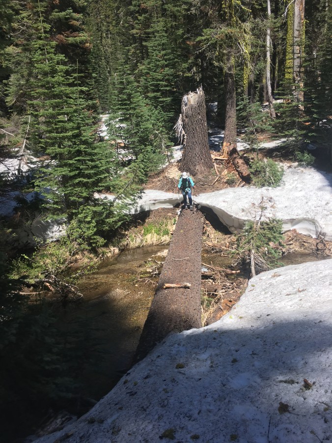 After our gear was dry, we continued to bushwhack our way towards the trail. The creeks here largely still have snow bridges or logs to cross on, so we made our way easily along the various tributaries. Even if we’d had to do a wet crossing, the creeks are nothing compared to the High Sierra. At least we have that going for us. We finally connected back up with the trail in a segment where it was alternating between dirt and snow. It was much more manageable. We finally crossed the creek that we’d been following (West Branch of Nelson Creek) and the snow slowly started to disappear. Finally!