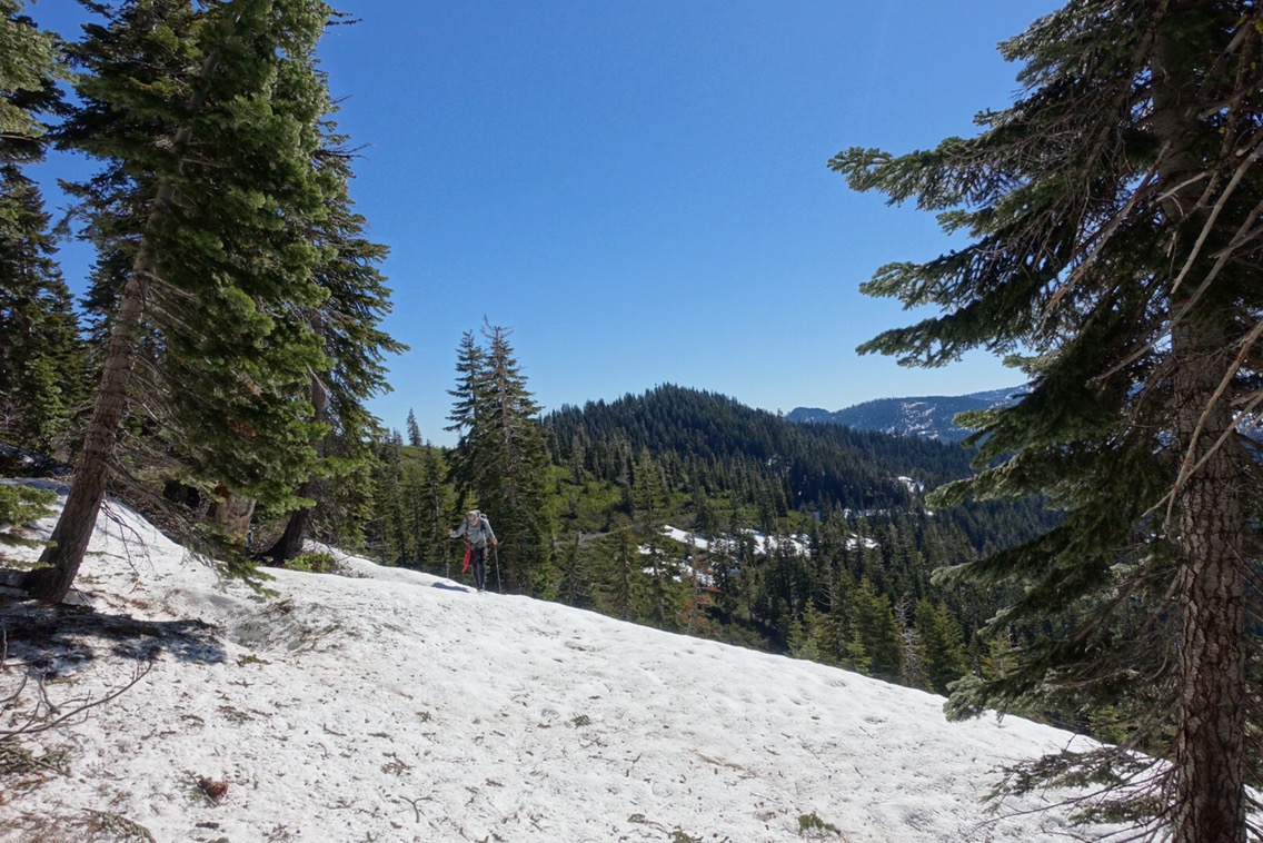 We tried following the path left by the prior hikers across the traverses, but it was tough because they’d generally made a upward path (which is easier) on a downhill trail section. This would land us in the middle of bushes that could be difficult to climb down. In one such section, I realized that the trajectory was off and tried to make a downhill correction. Big mistake. I lost my footing when the snow gave out beneath me. I tried to self-arrest with my whippet, but the snow was too soft and I couldn’t stop. I managed to slide more or less feet first, but as soon as I hit the tree well/trail, I found myself falling to the ground and on my back. Something hit my head, but I’m not sure what since it was all a blur (my whippet?). I stood up and everything seemed fine. My second pole was still up on the snow bank, so I used my whippet to climb back up to get it. Michael was following behind me and made it a few steps past where I slipped, and then, sure enough, he came slipping down the mountain too. He was caught further up in the bushes and ended up having to let his pack fall down towards me so that he could get up. This was clearly not working.