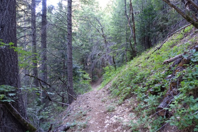 We started the day with a multi-mile descent to the middle fork of the Feather River. The trail was largely hidden in the trees — something that would make the going slow in the snow, but it was pleasant with dry trail. There were still lots of blow downs as evidence of the heavy winter snow, including a couple that I opted to remove my backpack for as I tried to climb over (or under) the fallen tree. It was freeing to be able to stretch my legs and walk alone for the morning instead of staying within yelling distance of Michael.