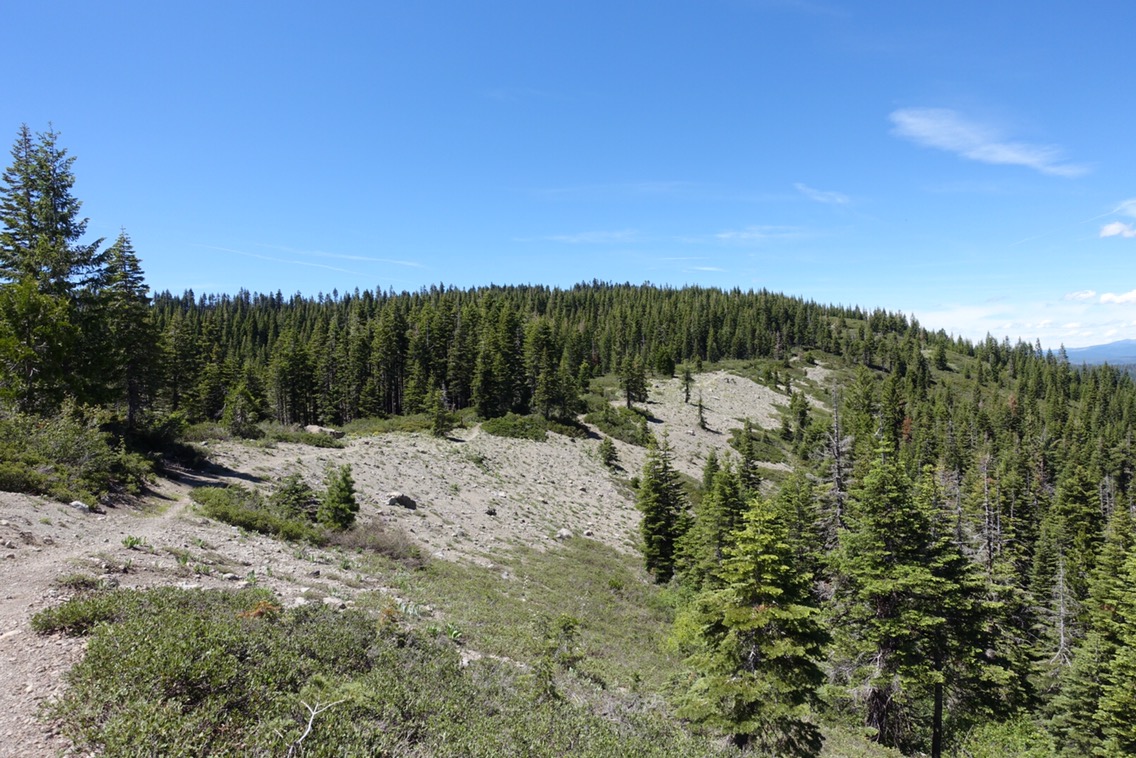 After a few miles our climb transitioned to a fairly exposed ridge walk that afforded us views of the surrounding mountains and Mt. Lassen in the distance. One of the most exciting parts of the view was that, with the exception of Mt. Lassen, most of the mountains were green instead of white!! We actually had to walk over a couple of minor patches of snow as the trail approached 5900 feet, but only a few steps. It was almost a snow-free day!!