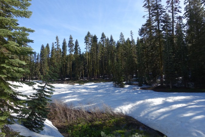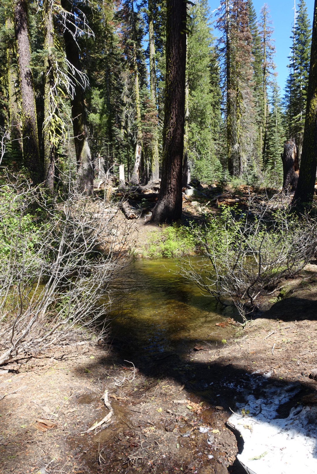 Our goal for the day was to make it through the snow section, but as it turned out we wrapped up the snowy section by mid-afternoon! Just at the end of the snowy section, we passed a creek that looked perfect for a swim. It was hot! Just as I was telling Michael about my idea, I realized that the trail actually crossed the creek at that very spot. We didn’t even look for a possible dry crossing. The water was calm and about mid-thigh high on me. An easy crossing in my sandals. The water was cold! By the time I crossed I decided that was enough swimming for me — I had cold feet (literally), but still a fun crossing. After crossing we noticed the log downstream… oh well. Shortly thereafter another hiker came up (our first person encounter for the day) and quickly crossed on the log. I guess not everyone wanted to go for a swim.