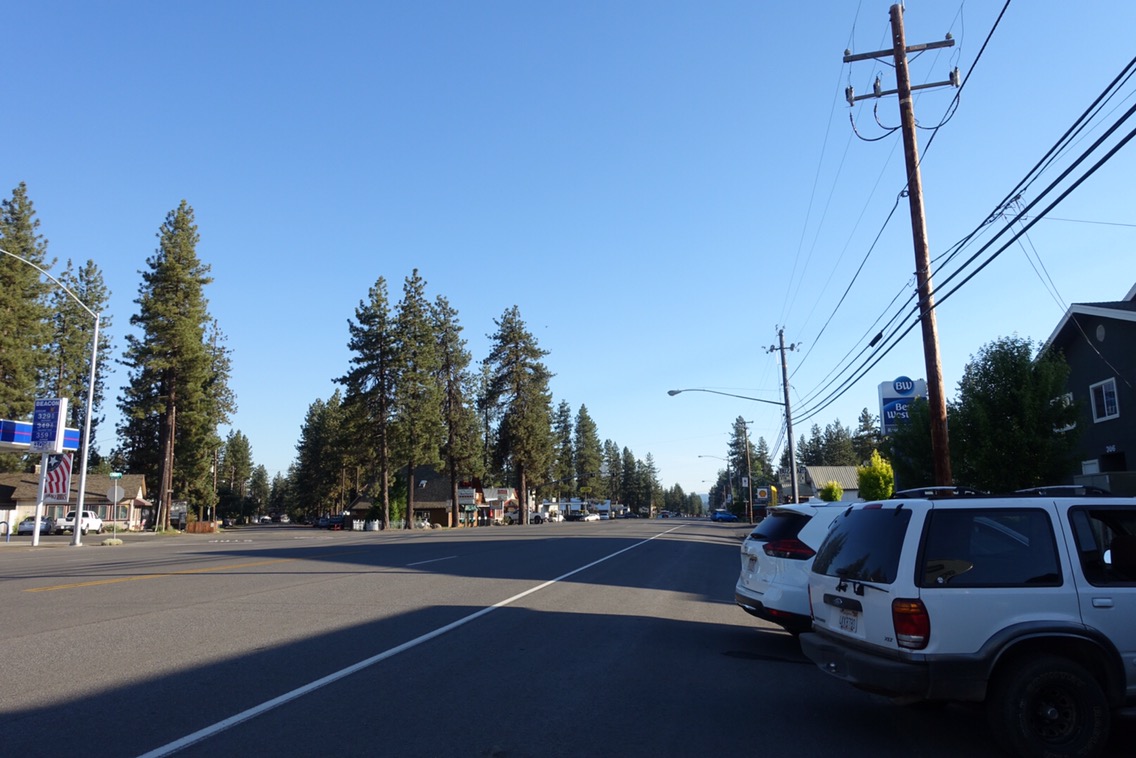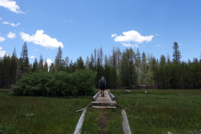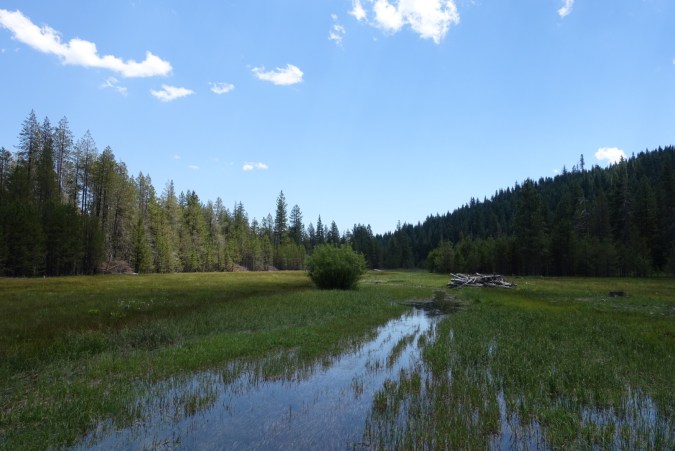 We crossed a large meadow before a short uphill climb to the highway. When we got to the road we started to worry. There was construction going on and a lead car was being used to direct traffic in a single direction at a time. How could anyone pull over under these circumstances, even if they wanted to? As soon as all three of us were at the road I stuck out my thumb. The group of cars going in our direction had almost finished passing, only a few semi trucks and a California Highway Patrol (CHP, our state police) vehicle were left. Matt commented that there was no way we’d get a ride. And then the CHP vehicle pulled over and a hound officer was offering us a ride to Chester. Score!! The officer was super nice and knowledgeable about the PCT in this area. He gave us food recommendations in town and told us about the history of logging operations in the area. An all around awesome guy and we were grateful for the lift.