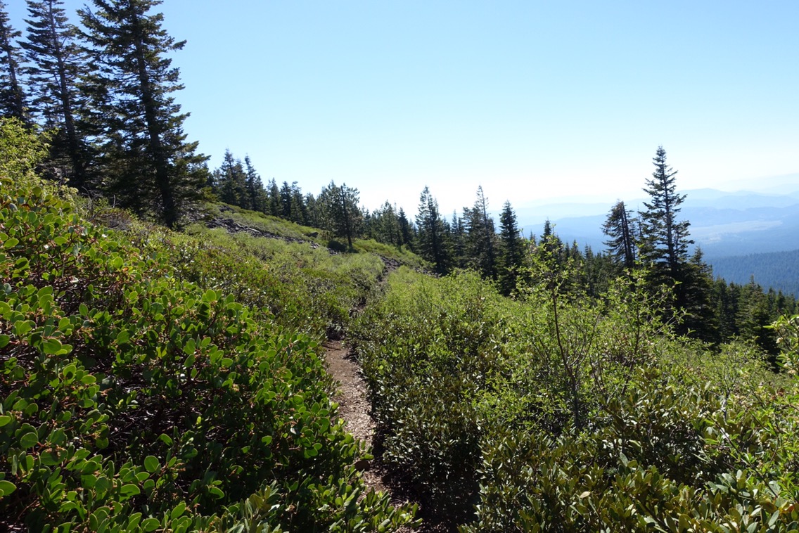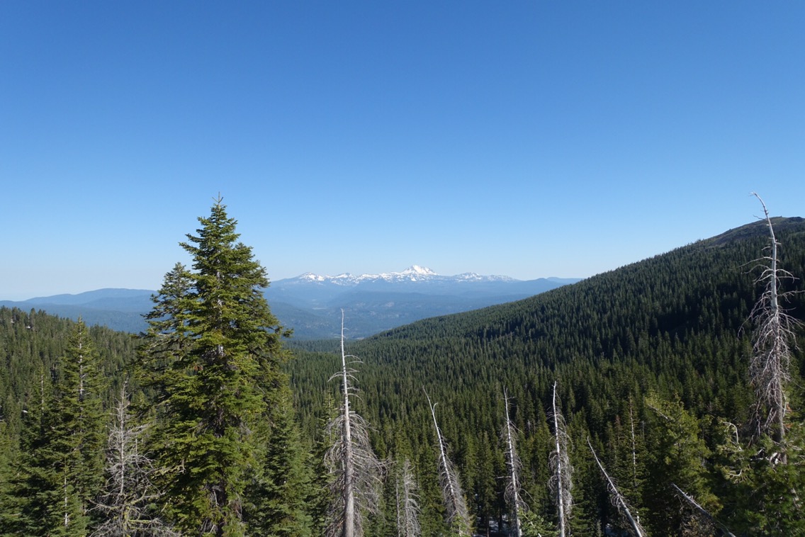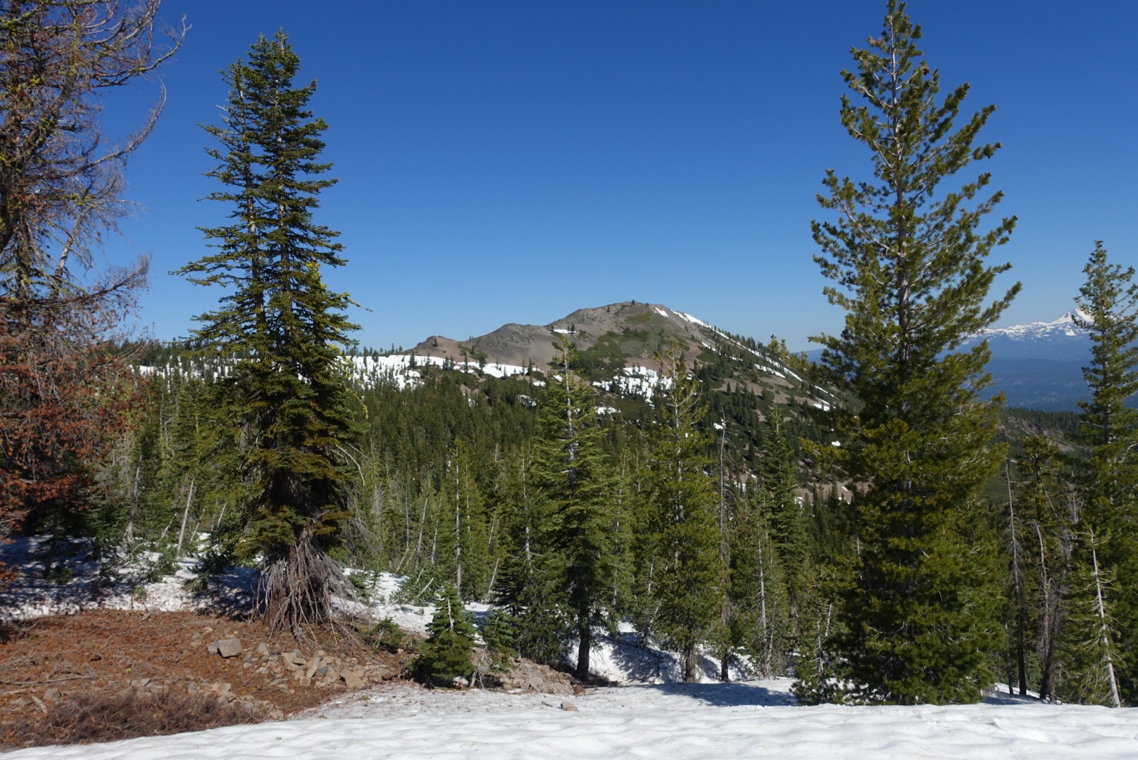 We’d been expecting the snow to start right around mile 1316, but were pleasantly surprised when we got another mile or so of reprieve before the patches started. Matt took the lead once again as we made our way further up the mountain. We managed to avoid traversing one of the steep slopes by staying up on the ridge. Then it was route finding through the trees for a bit (or at least Matt was route finding, we just followed). As with yesterday’s section, by following Matt’s lead today’s snow section likely went much further than it would have had we done it on our own. As it was, we were clear of the snow before 10am!