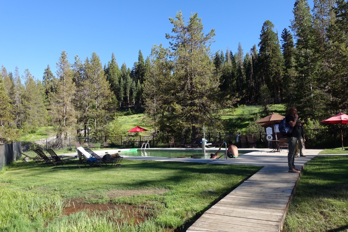 We confirmed our dinner reservation (we called ahead from the trail head this morning) and then took advantage of the free shower and pool for “guests” (purchasing a meal counted)! The shower (and towels) felt awesome, even though we’ve only been on the trail for a day. The pool was surprisingly warm (it’s heated by the hot springs) and we hopped in and out a couple times before simply deciding to relax alongside the pool. Technically, the pool was only open to PCT hikers from 5:30 to 7:30, but it wasn’t particularly busy and we were able to swim before 5.