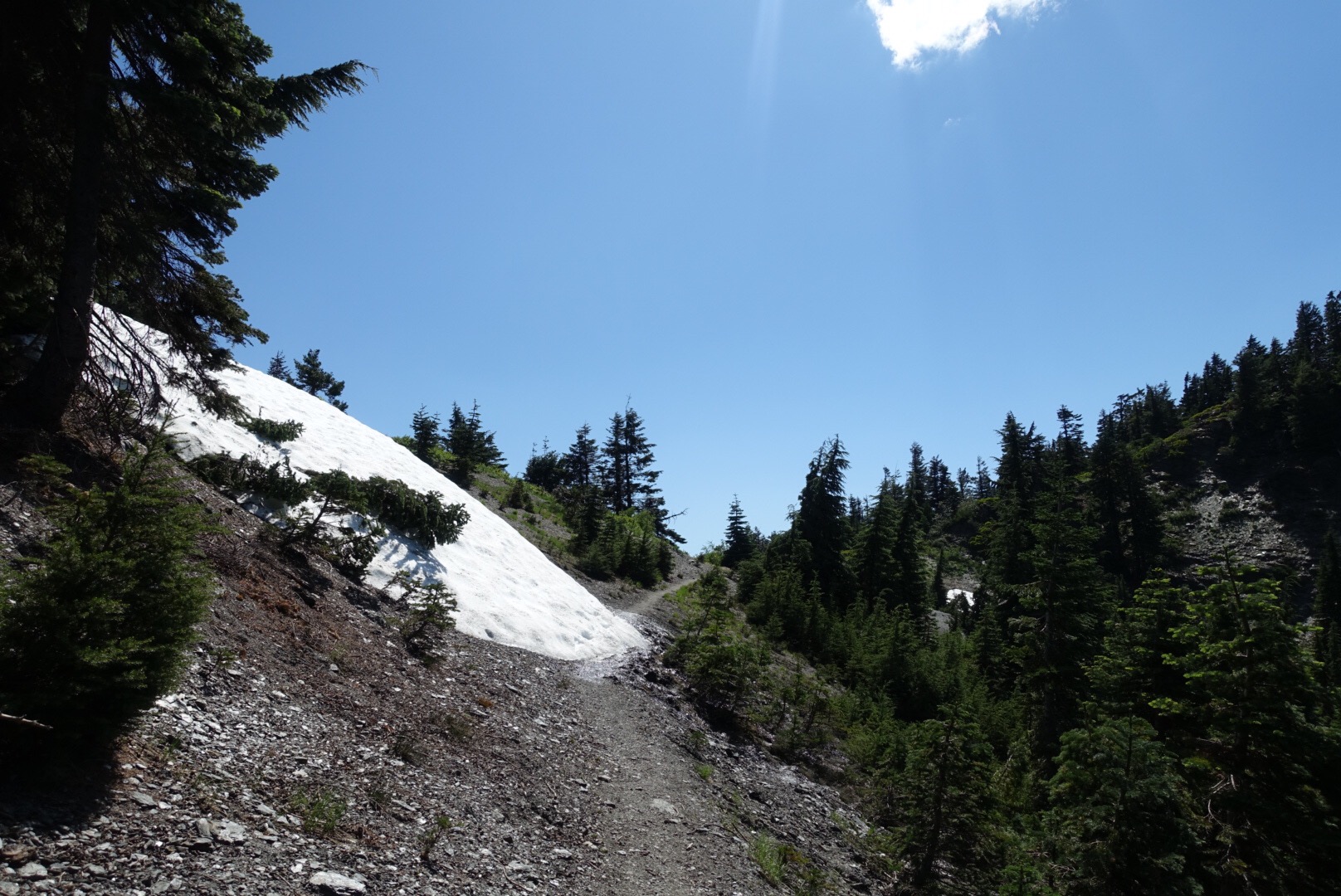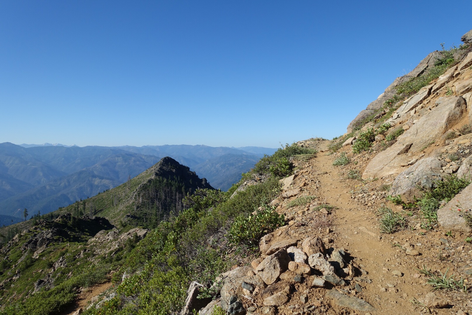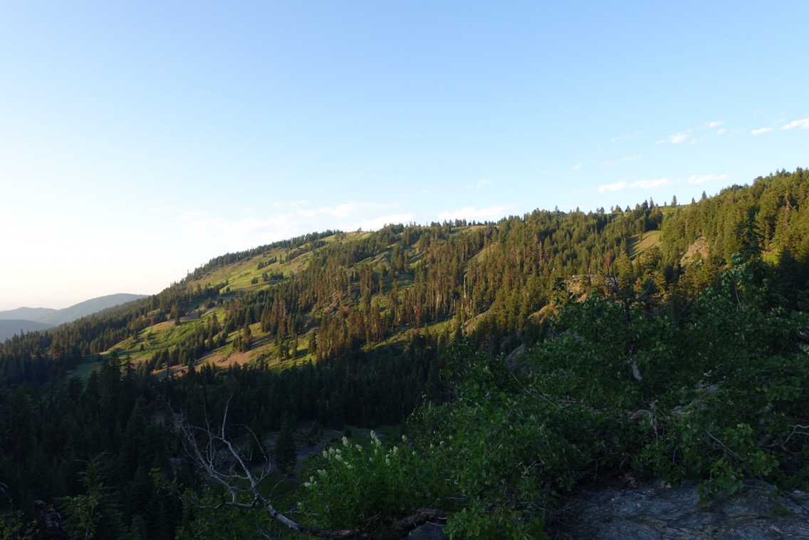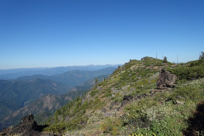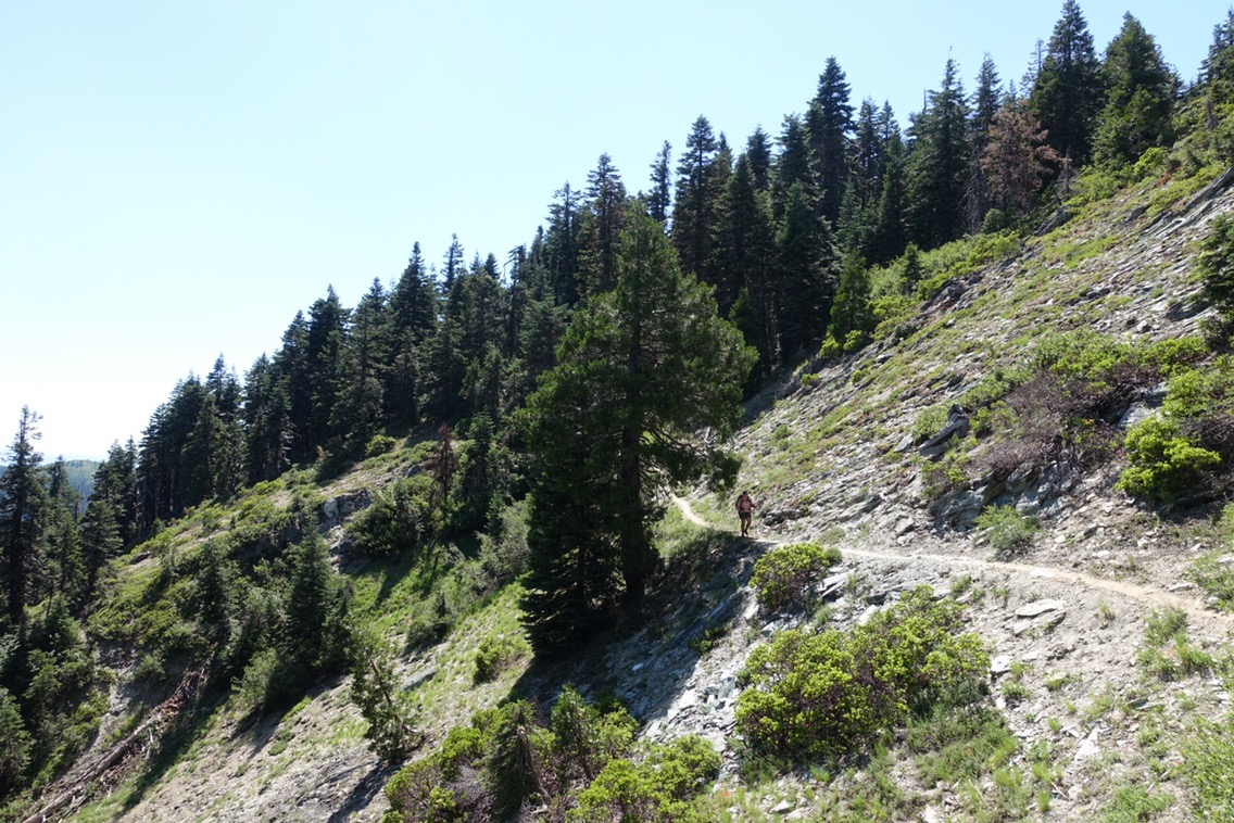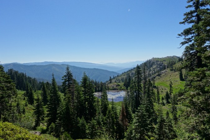 The trail led us along the ridge line for a good part of the morning. This provides for large, expansive views… that aren’t particularly varied compared to the granite mountains that we had been walking through. Lots of green, tree-covered mountains.