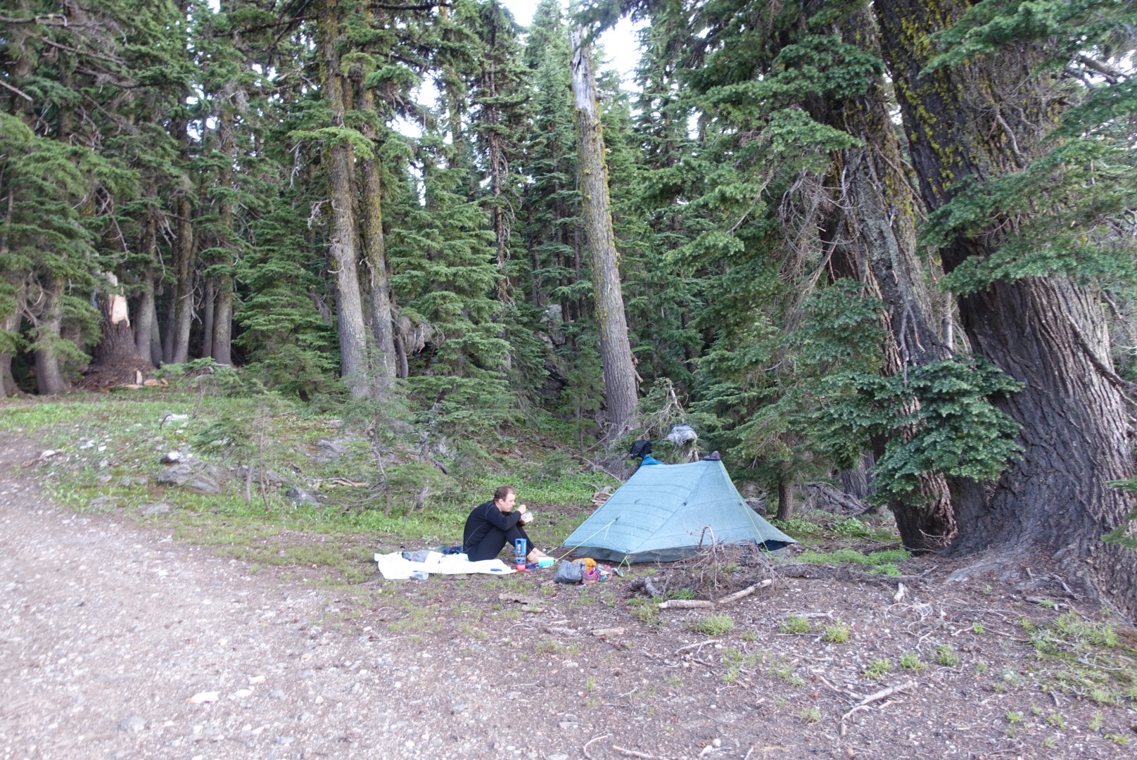 A service road that wound down to the spring provided a welcomed alternative to the steep, eroding use trail that went directly down the mountain. I was surprised to find that the area around the spring had a lovely view of the surrounding hills lit by the sunset. We even managed to eat dinner outside our tent to take full advantage of the views!