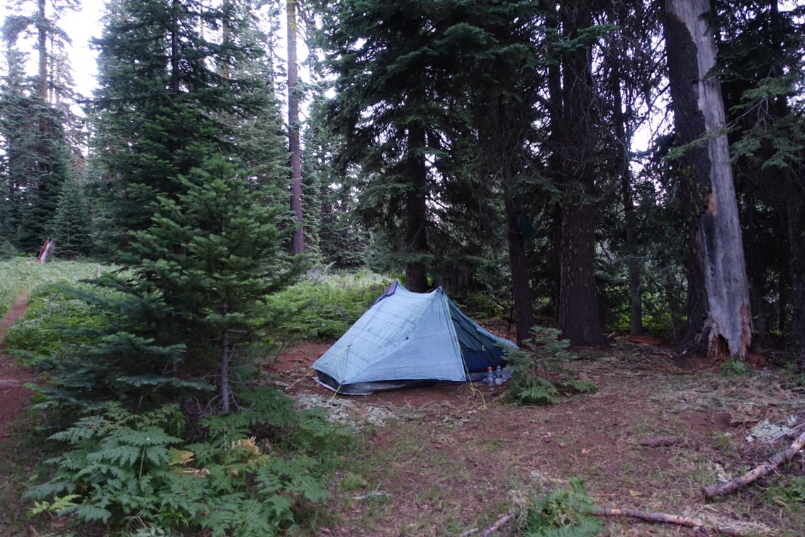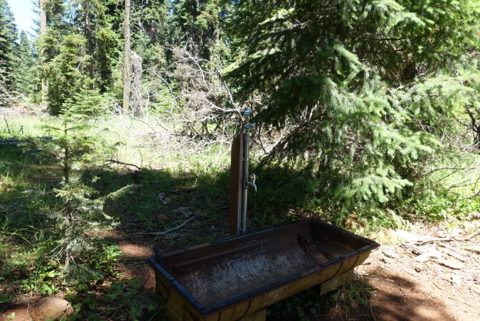 The afternoon again took us through a big forest. This time it was super flat and apparently crossed private land. There were no trespassing signs on every other tree lest we forget that we are not to stray from the PCT. Later, once we crossed back over to park service land, we were the beneficiaries of an odd sight. A spigot right on trail. With potable water! Sweet! That’s got to be our easiest water on trail yet.