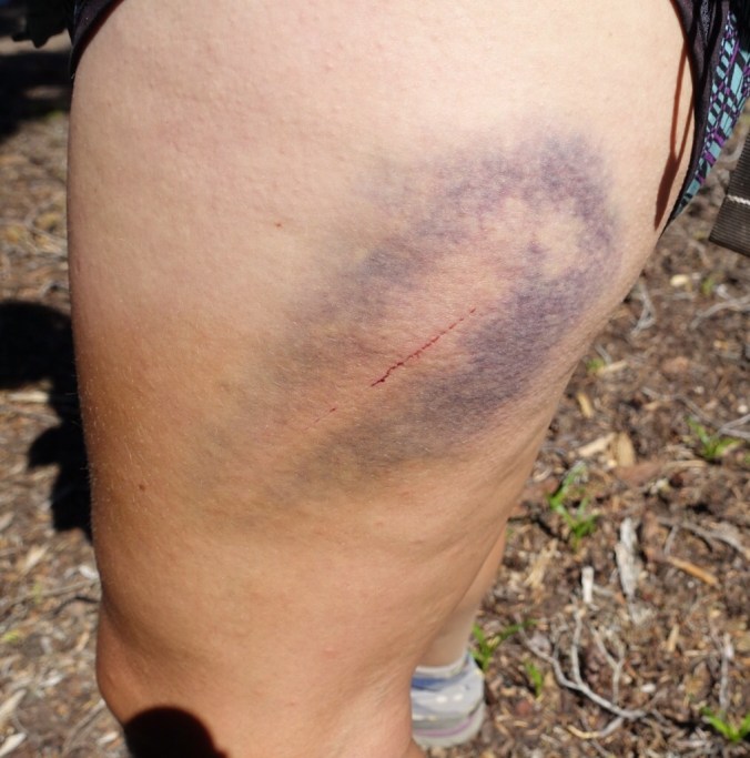 I slept surprisingly well on Saturday night considering I basically couldn’t sleep on my left side due to banged up thigh. I slept it until 8am!! By morning, my foot was still feeling sore, but it wasn’t hurting quite as much when I walked. I still iced it several times and am hoping that it turns out to just be bruised. Speaking of bruised, my thigh is looking spectacular — I have a huge bruise surrounding my scratch!