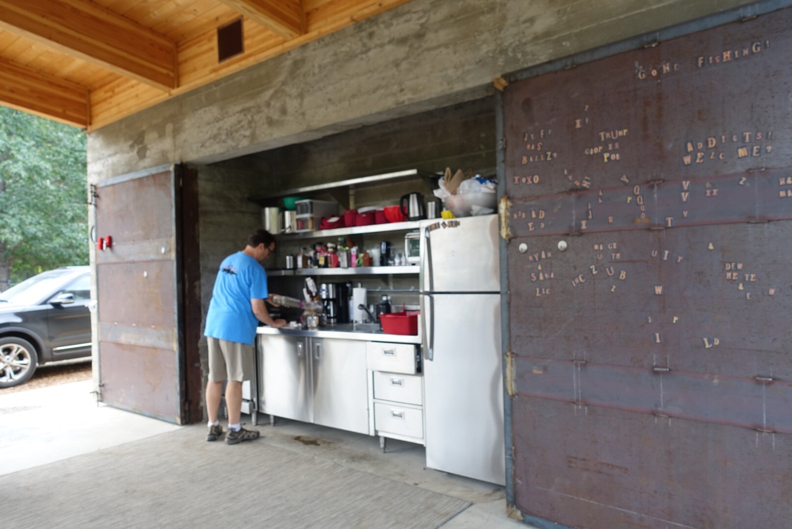 In the daylight, Tom’s place looked pretty awesome. The covered dining area was a great spot to escape the hot sun and socialize (while constantly slipping a cookie or rice crispy treat from a big tub of treats). We were joined for the weekend by Tom’s son and some of his friends. While they slaved away building a rock wall (they claimed it was fun), I sat around taking advantage of the lazy day. Tom had tons of fun camp-related toys too — everything from BB guns and throwing knives, to archery and corn hole. Couldn’t ask for more!