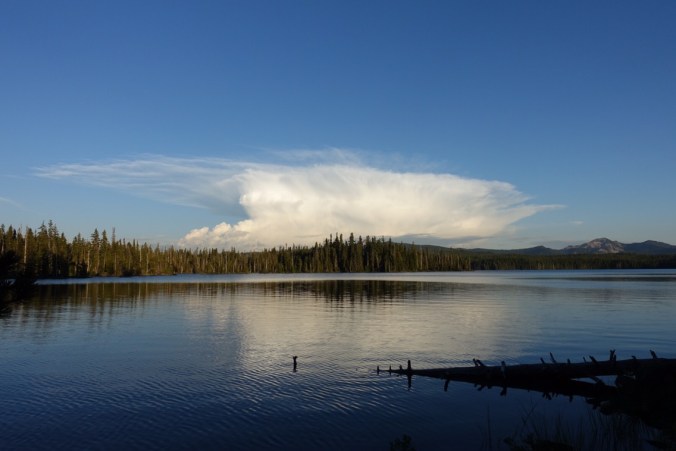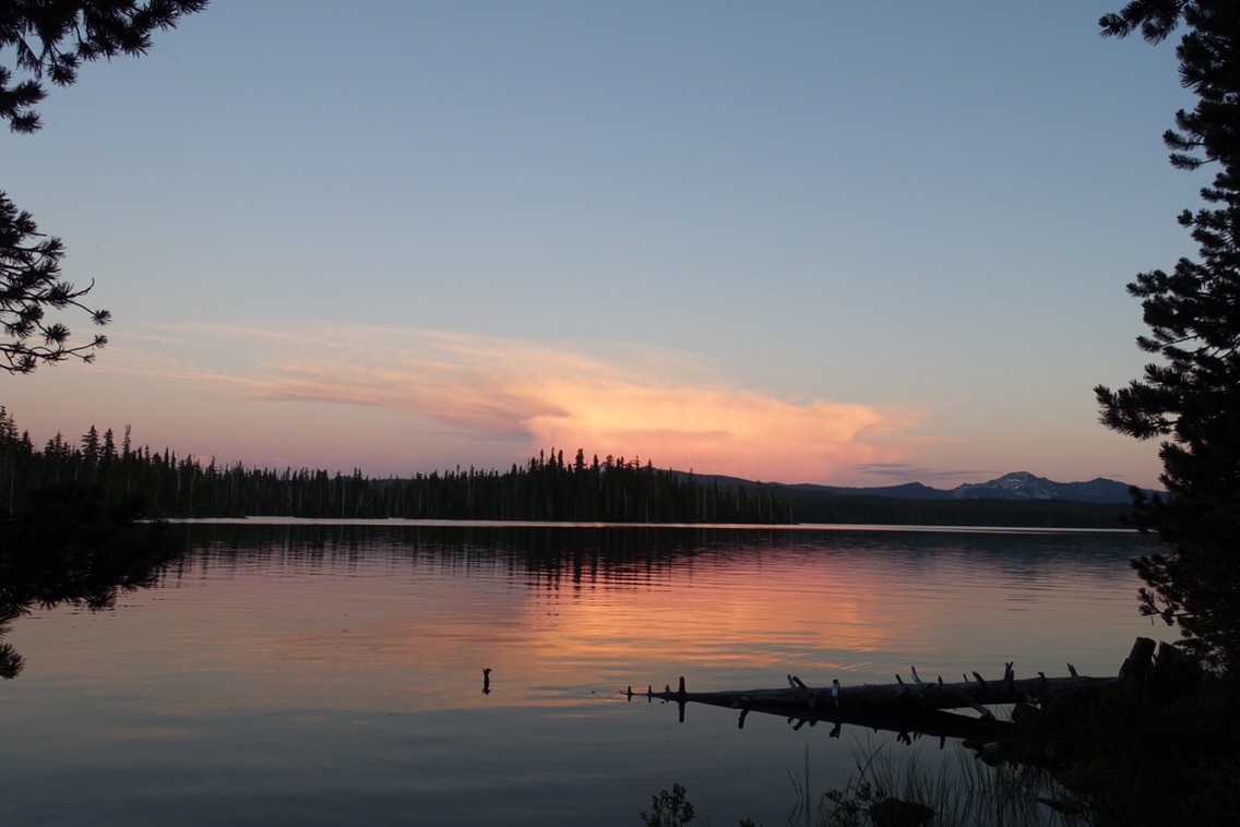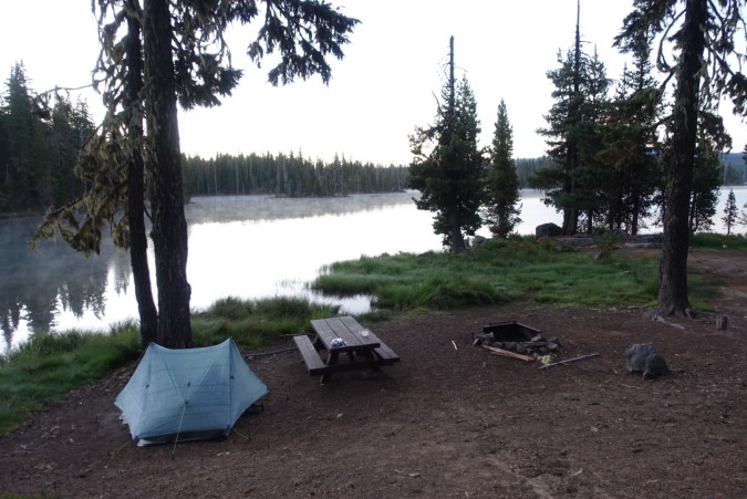 There was a group of three people already at the campground BBQing hot dogs. They offered me one and a beer. Score! One of the guys was section hiking the PCT and had lots of questions about my gear and planning. The other two lived in the area and were picking him up. It was great to chat with them and “help” them with their hot dogs, beers, and soda. They even left a couple drunks behind for us. So nice! We normally don’t build campfires along the trail, but they’d already started one, so we got to enjoy it after they left while we ate our dinner at the picnic table. With the lake shore right next to our campsite it was easy to be sure that we’d completely doused the fire before retiring to our tent for the night.
