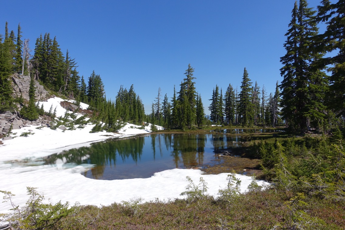 Near the end of the snowy section, we passed a lovely pond that was still surrounded by snow. The ice along its shore and sticking out into its waters was a beautiful glacial blue. I was pondering what would happen if one were to slip along the trail and fall into the pond when… I fell on my butt. Luckily, I did not fall into the pond, but I couldn’t help but laugh at myself as I tried to get up.