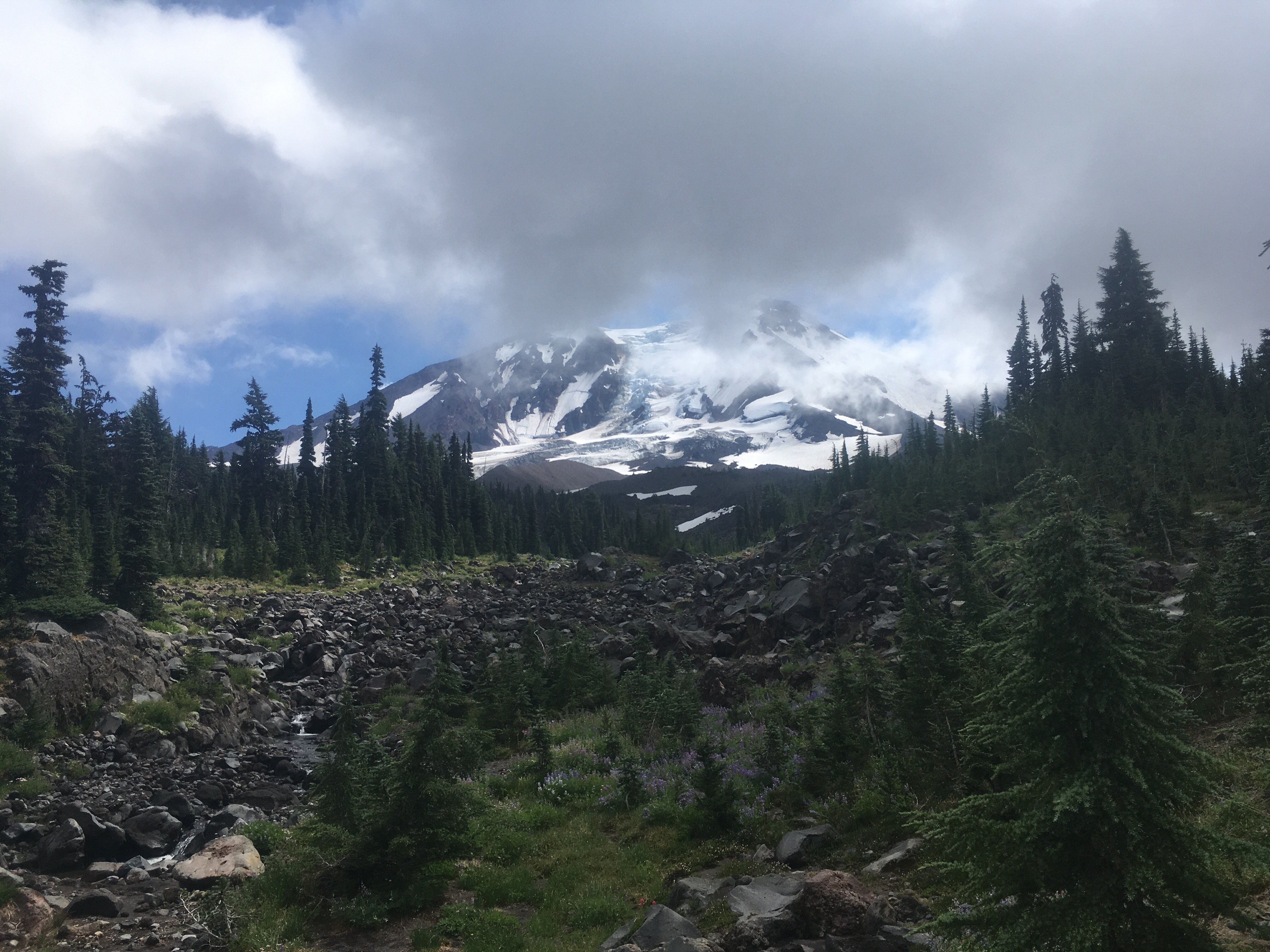 Our first eight miles today were a steady climb of over 2000 feet. Much of that time was spent walking through a burn zone. This got us out of the green tunnel, but because of the low clouds and rain we didn’t get any views. It also meant that when there was rain, it was difficult to find a spot that would provide any protection. Finally, just before lunch the sun started to come out. I found a spot in a clearing full of boulders where we could put all of our gear out to dry (and luckily the rocks weren’t super wet like most of the area we were hiking through). Our timing was perfect. We were able to warm up a bit and get everything dried off just before the clouds came rolling back in.
